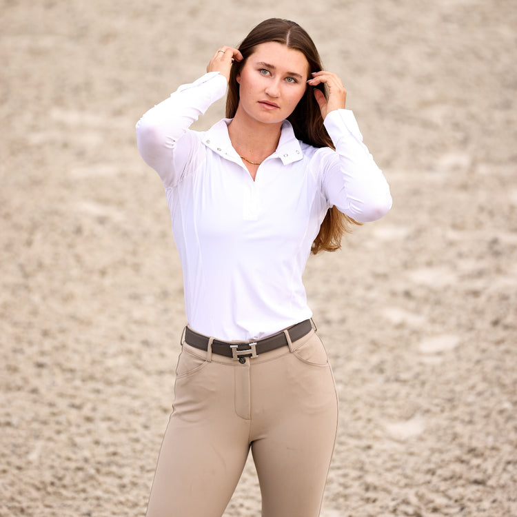 Meet SKYLAR: SLOAN's sleek sister. Our ring-ready competition top is extra flattering. Made with the athletic technology you know (and love) from our schooling tops - SKYLAR is ultra sleek with a new logo placement. Breathable, moisture wicking fabric keeps you cool, focused & on-top of the leaderboard.